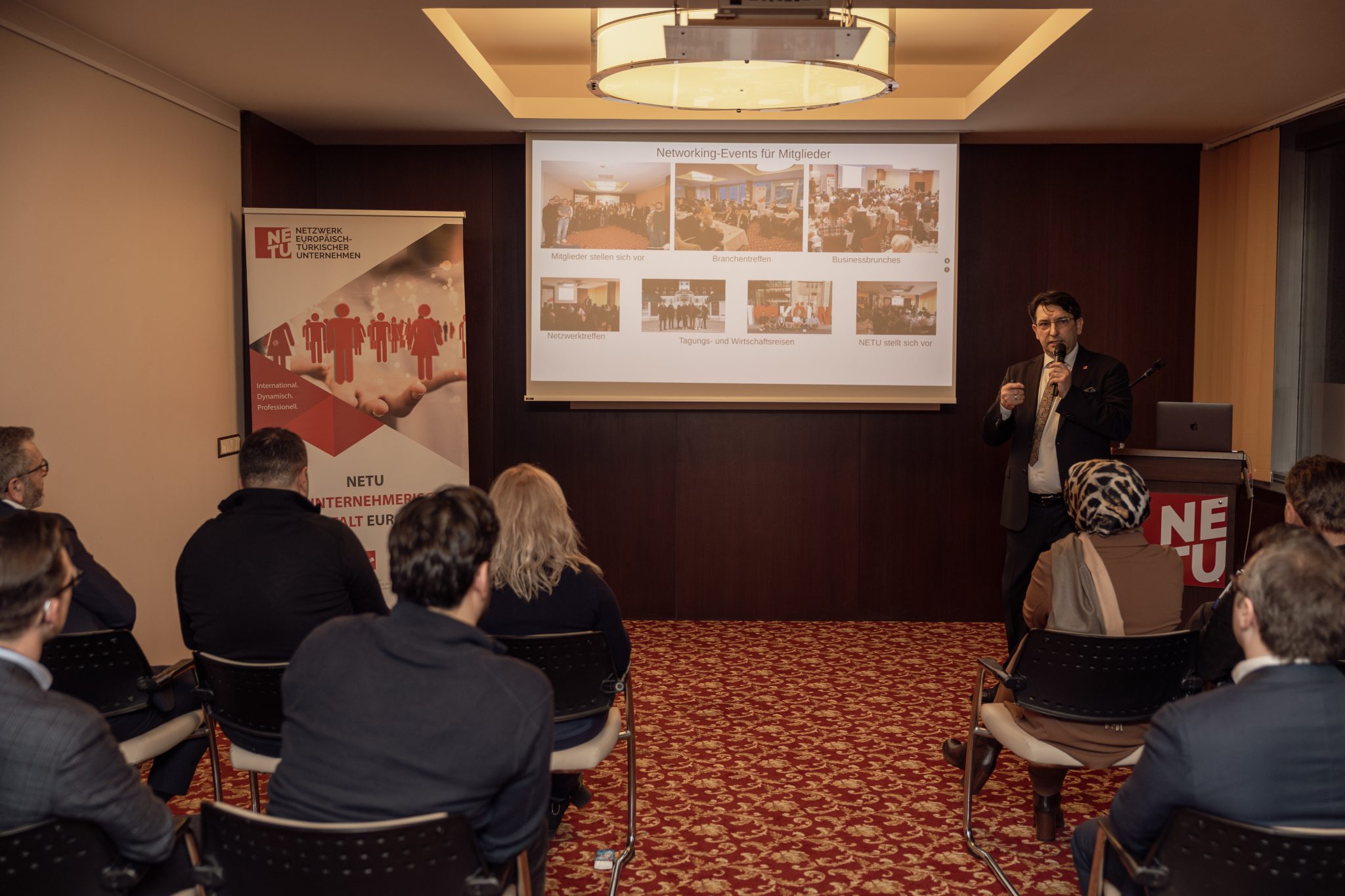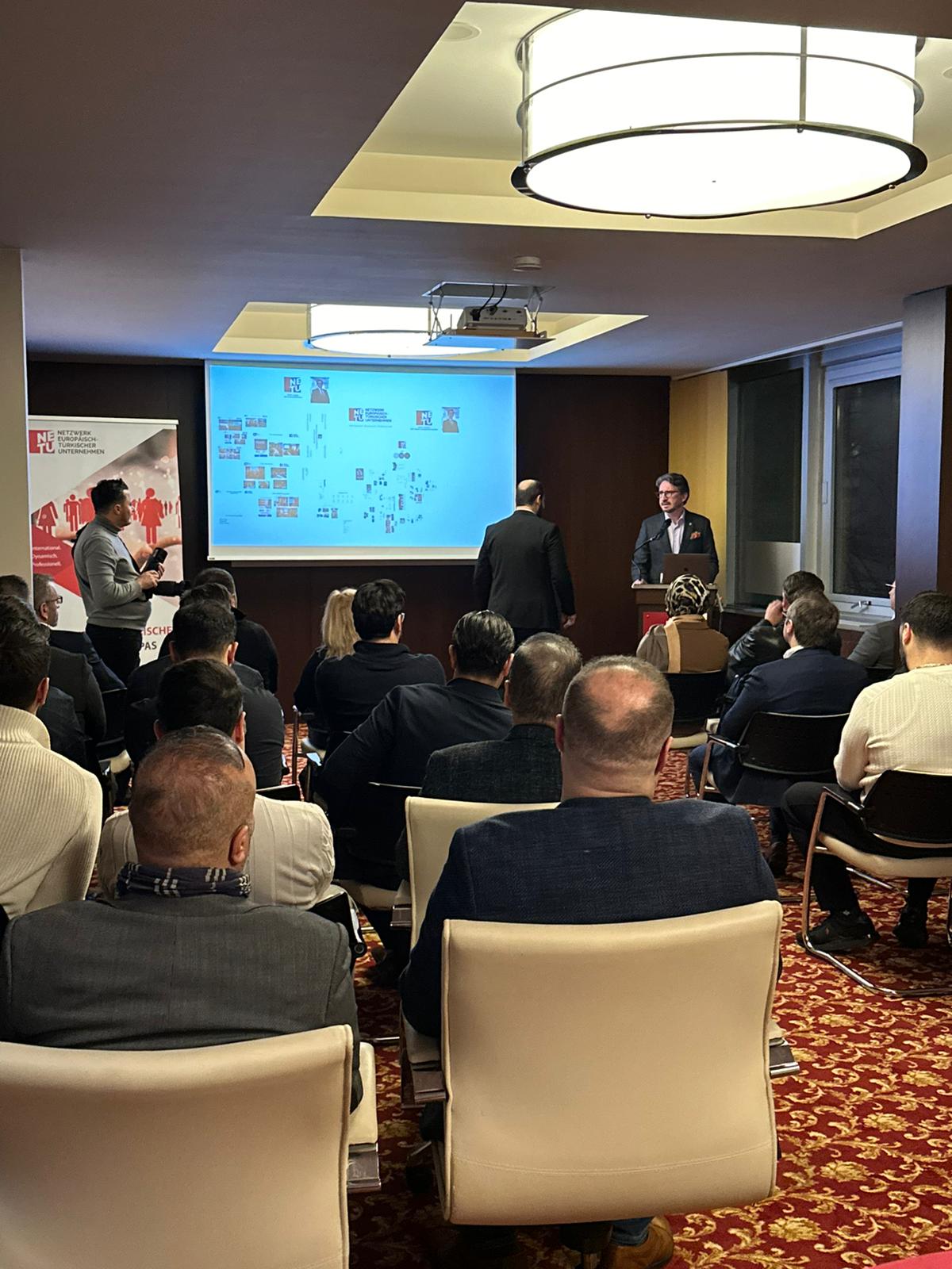 Auf Anfrage zahlreicher Unternehmen aus Berlin und dem Bundesgebiet veranstaltete NETU Berlin einen Kennenlernabend. Rund 40 Unternehmen mit und ohne Migrationsgeschichte kamen auf persönliche Einladung des Vereinsvorstands zusammen, um sich zum Verband, seiner gesellschaftlichen Rolle und zu den Mitgliedervorteilen zu informieren. Im Anschluss zum NETU Imagefilm begrüßte der NETU Geschäftsführer, Önder Costan die Gäste und informierte sie zum Programmablauf.