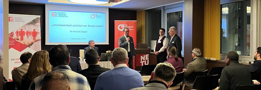 Wir bedanken uns herzlich bei Hr. Bittner, Regionalleiter des BVMW für Berlin Brandenburg, bei Herr Beinlich vom BVMW, der gemeinsam mit dem NETU Geschäftsführer, Önder Costan den Abend moderiert hat, bei unserem Experten, Herr Ronald Ziegler, der zehn neue Gesetze praxisnah und verständlich vorgestellt hat und bei allen Unternehmerinnen und Unternehmern, die mit großem Interesse und Beiträgen die Veranstaltung bereichert haben. Zum Dank für den tollen Vortrag hat unser Vorstandsvorsitzender, Bülent Göktekin Herr Ronald Ziegler auch ein kleines Präsent überreicht.